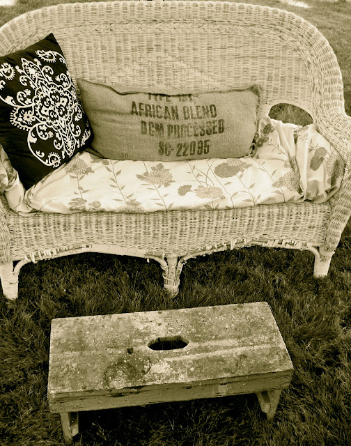 Sit down, put your feet up, and enjoy a cold glass of lemonade! This shabby wicker bench was my find of the summer from a local rummage sale. It came with 2 matching chairs and a small side table ALL for $20!! To make an inexpensive cushion for the bench, I took a vintage sheet I had found at an estate sale and wrapped it around a folded up blanket. I then cut up a burlap coffee sack and sewed up this pillow! I also threw in one of my target pillows. I found this gray, paint splattered stool ( I am obsessed with wooden stools!!) at an estate sale and thought I should leave it just as it is!